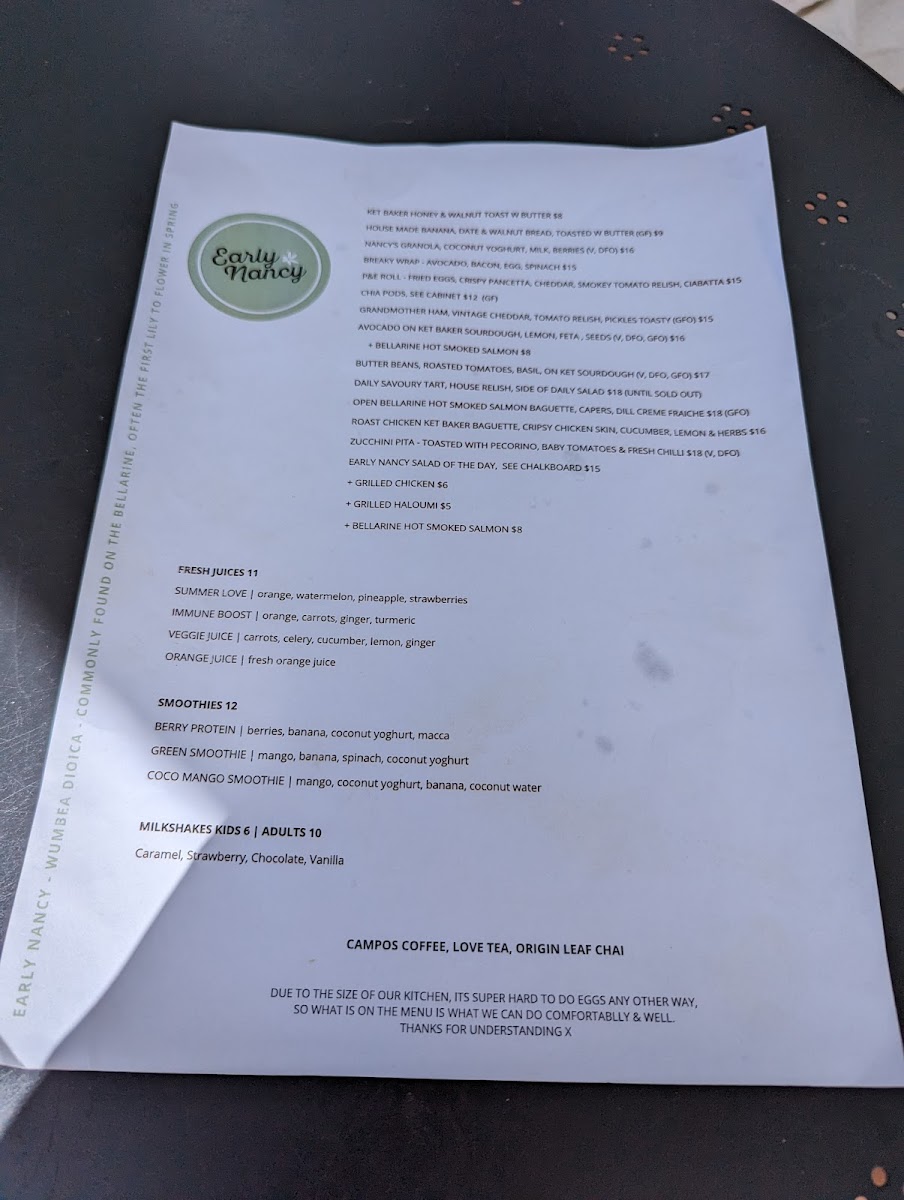 Welcome to Early Nancy, a charming café nestled in Point Lonsdale, VIC. This delightful eatery stands out for its inviting atmosphere, friendly service, and an innovative winter menu that is sure to satisfy. Dive into hearty options like the Porridge with Rhubarb Crumble for A$17 or indulge in the Pan Fried Gnocchi for A$24, each dish crafted with fresh, local ingredients.